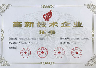 2017年2月23日,河南云帆电子科技有限公司拿到了国家级高新技术企业的证书,有河南省科技技术厅、河南省财政厅、河南省国家税务局、河南省地方税务局的盖章认证,这一证书证明了云帆科技的专业技术能力、研发创新能力以及公司的服务质量。就如我们的宗旨:服务为先,专业致胜。接下来会坚持做到更好!